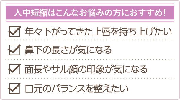 生まれつき鼻の下が長い方や、加齢によって鼻下の皮膚が伸びてきた方におすすめの治療です。