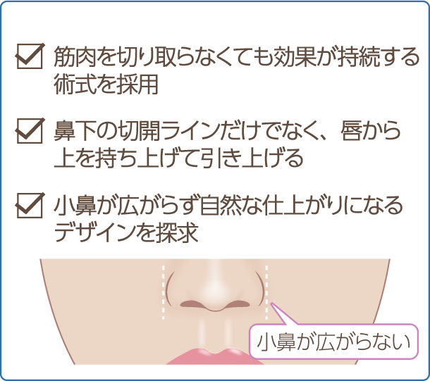 ラクルでは、人中の長さや顔のバランス、シワの状態を考慮して切開ラインのデザインを決めています。