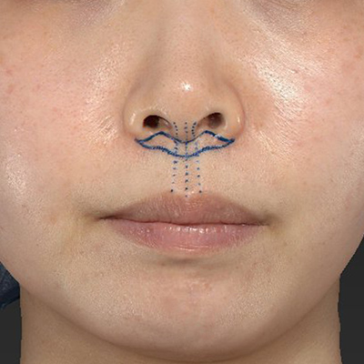 デザインは、患者様のご状態により異なりますが、小鼻の変形が起きないように、かつ、お傷痕が目立たなくなるようなデザインを心がけています。今回は、最大皮膚切除幅は4.5mmとしました。