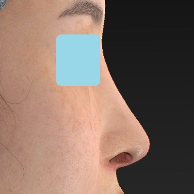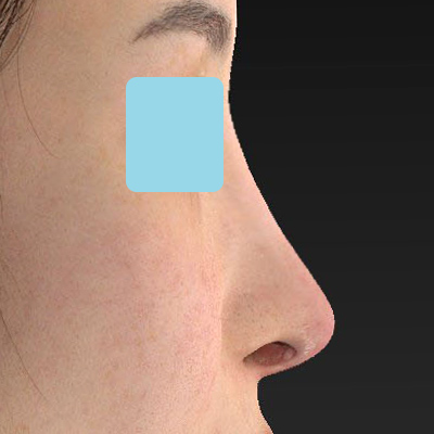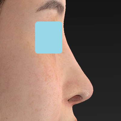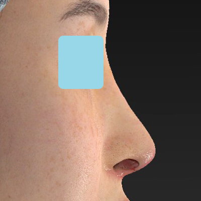鼻背部の鼻プロテーゼが右側に変位しています。「鼻中隔延長(鼻中隔軟骨)+鼻尖形成+耳介軟骨移植+真皮脂肪移植」で、L型プロテーゼが透けてしまった鼻尖を、自然で立体的な形状に整えていきたいと思います。