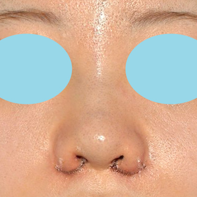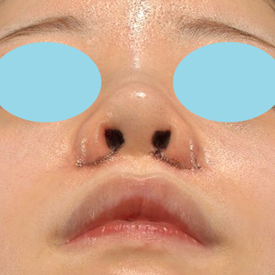 手術直後で腫れがあり、糸も付いているご状態です。小鼻の横幅が小さくなり、鼻翼基部の凹みが改善しています。
