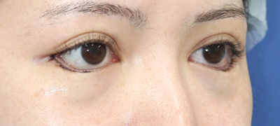 抜糸直後のご状態です。まだ腫れと赤みが残りますが、皮下出血は出ませんでした。手術前と比較して、目が外側と斜め下方向に拡大しています。