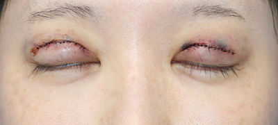 麻酔液と手術操作により腫れが出ています。広い幅の重瞼線の剥離を行ったので、通常よりも皮下出血や腫れは出やすいご状態でした。