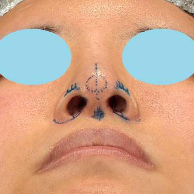 正面から見て鼻孔縁が上がっている方は、下から見ると、鼻孔縁が後退しています。「鼻孔縁下降術」では、お鼻の穴の内側から皮膚軟骨を移植するので、定着も含めて、お鼻の穴の変化をご覧いただきたいと思います。今回は、左側の鼻孔縁がより後退していました。お鼻の穴も小さくしていきたいと思います。