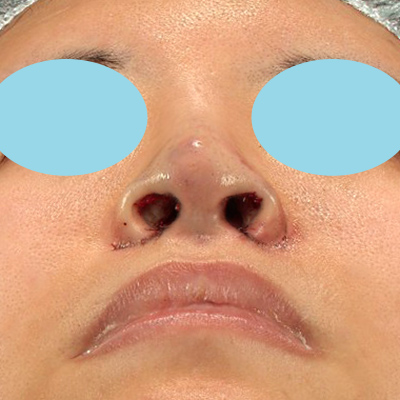 手術直後で腫れています。この後で、皮膚軟骨を鼻翼の外側から、縫合固定していきます。鼻先も腫れが出ています。