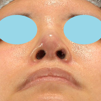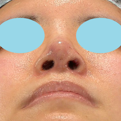 お顔は同じ角度ですが、小鼻の横幅が小さくなり、鼻孔縁が下がり、お鼻の穴が目立たなくなっています。まだ腫れと赤みが残ります。