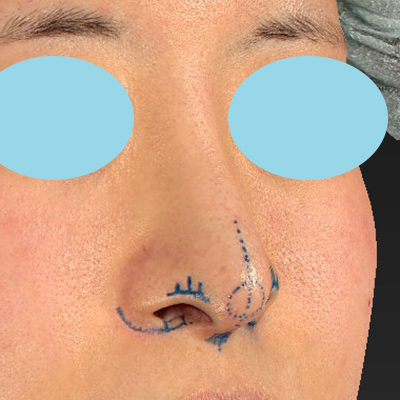 鼻孔縁下降術では、下げたいところをデザインしています。鼻先は耳介軟骨移植の位置を仮にデザインしていますが、術中に調整が必要です。