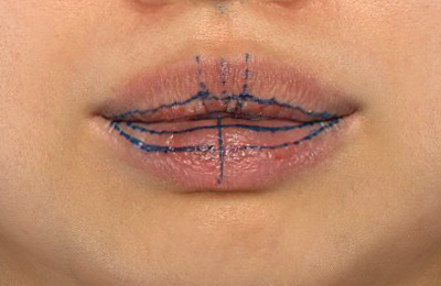 上下とも口唇を薄くして、上口唇はM字型にしたいと思います。下口唇は外側に出ているのを、内側に引っ込めたいと思います。