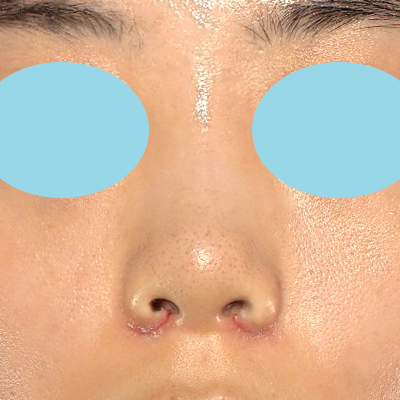 まだ腫れているご状態です。お鼻の穴の丸みが失われないように気を付けて手術を行っています。お傷痕の赤みがまだ残ります。