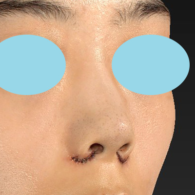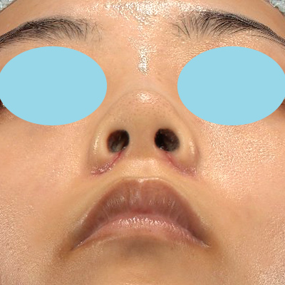 まだ、腫れが残る時期なので、鼻先が丸いです。「小鼻縮小+α法」の、お傷のご状態はこのような感じになります。この方は、赤みが出ています。