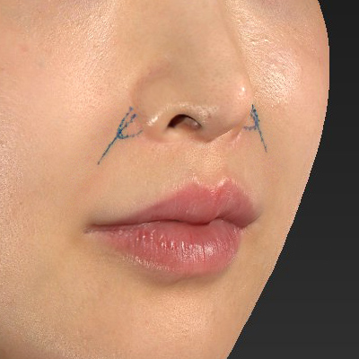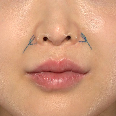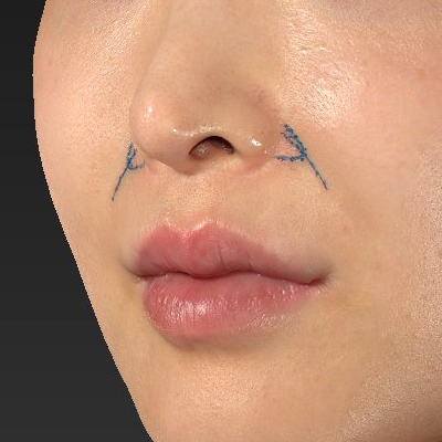 鼻翼基部の凹みが浅くなっています。小鼻や鼻の穴、上口唇などに特に変形は認めません。