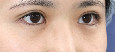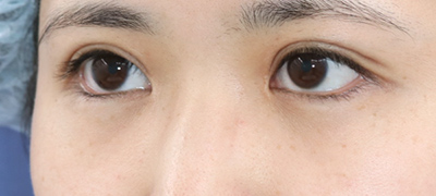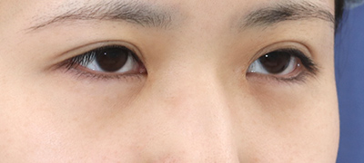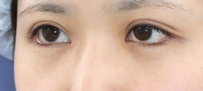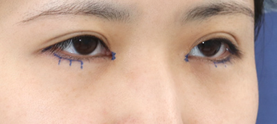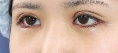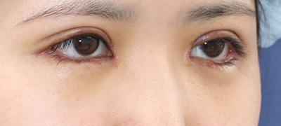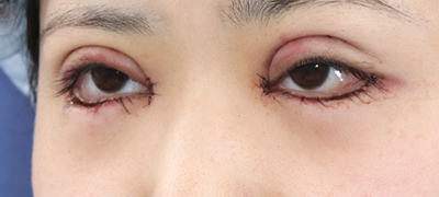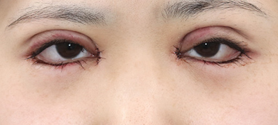 抜糸直後のご状態です。まだ、お傷の腫れと赤みがありますが、手術前と比べて、目の大きさが外側と内側、斜め下方向に拡大しています。