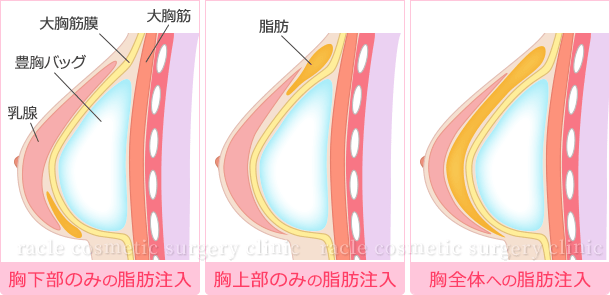 また、脂肪が少ない方は胸を触るとバッグの感触が分かってしまうこともあるため、バッグの上部に同時に脂肪を注入することで触れたときの感触は脂肪のまま、バストの大幅なサイズアップも叶います。