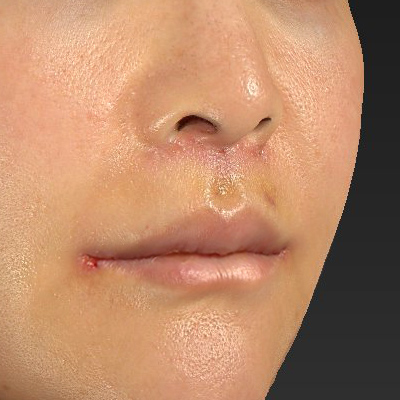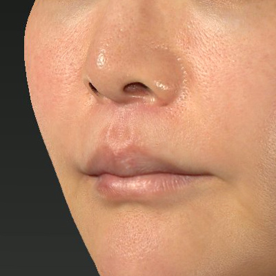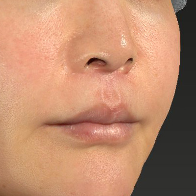 鼻下の距離が短くなり、口角が自然な形に上がっています。鼻下全体が上がったことで、鼻下の形状は「Cカール」に変化しています。