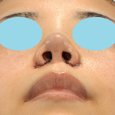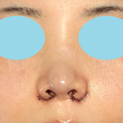 手術直後で腫れがありますが、小鼻は内側に移動しています。小鼻縮小+α法の縫合の糸はご覧のようになります。