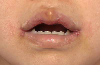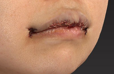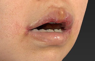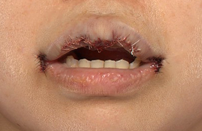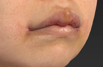 抜糸直後のご状態で、お傷の赤みと腫れが目立ちます。上口唇は腫れています。